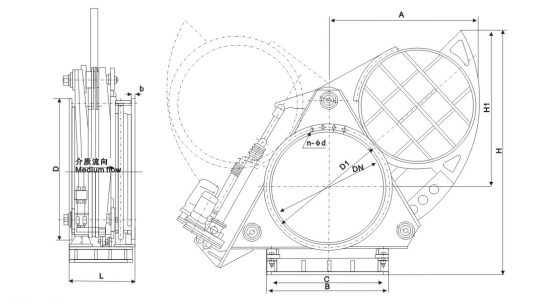 液動扇形盲板閥主要由左閥體、右閥體、絲桿副、翻板、密封圈、杠桿、液壓油缸等零件組成,并由底座、支撐柱構成一個剛性結構體。閥門中設有夾緊油缸和翻板油缸,夾緊油缸通過杠桿副和絲杠螺旋副驅動左、右閥體完成松開、夾緊動作,翻板油缸驅動翻板完成開關動作。橡膠密封圈鑲嵌在翻板上,具有耐高溫、密封性能好、更換方便、使用壽命長等特點。